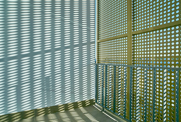 Arcadia Muse® Perforated Metal is most commonly manufactured from Aluminium and can be utilised for privacy screening, solar shading, Facade Feature as well as providing ventilation. In addition to all the practical advantages of the Muse ® Perforated Metal Panelling, the panels create strong aesthetic possibilities using colour and texture to create a design feature that is easily integrated into a building façade. Natural lighting and airflow permeate through the panel, of which both factors are considered beneficial. The Muse® Perforated Metal Panelling delivers a security, privacy screening, solar shading, natural ventilation, and weather shielding solution which collectively will reduce the carbon footprint of the building.